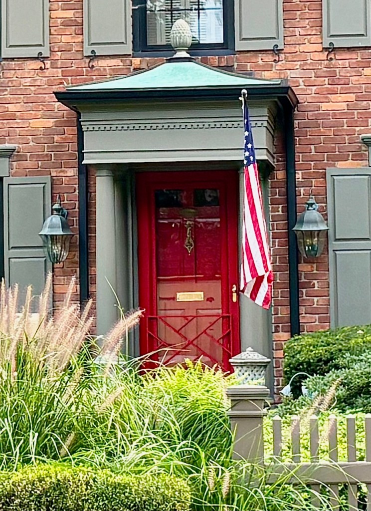 This classic colonial is perfect with its cherry red door -accented with not bright white – but a light ecru white which gives it an elegance bright white would not have accomplished. Bright flowers and symmetrical urn pots further its charm. We also love the decorative millwork at the top of the portico and the roof overhang – they add interest and elevate the overall facade. This entrance is strong yet pretty, elegant yet playful.